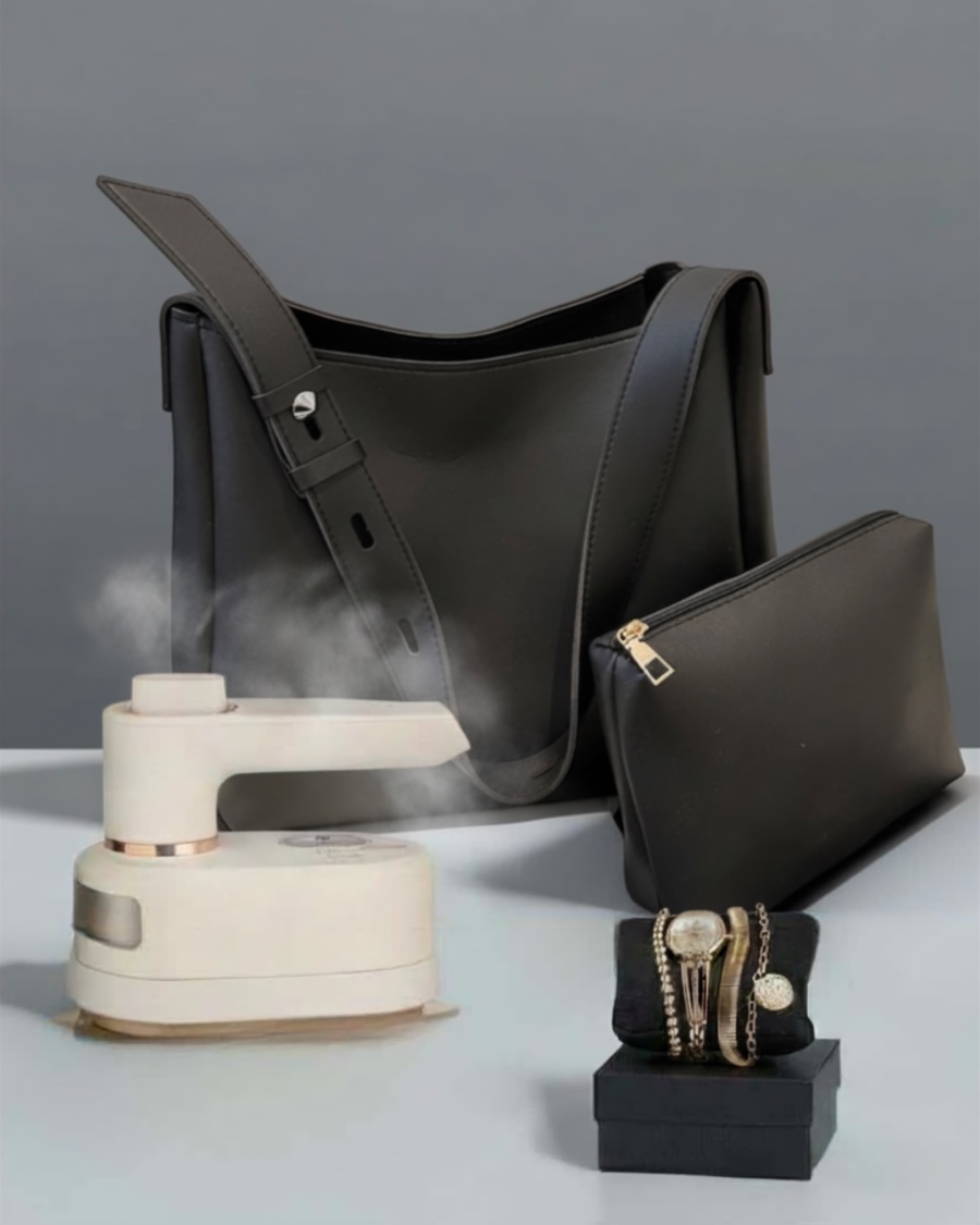 2 сумки и косметичка из эко материала, модные часы, 3 браслета, утюг - предметы повседневного пользования.